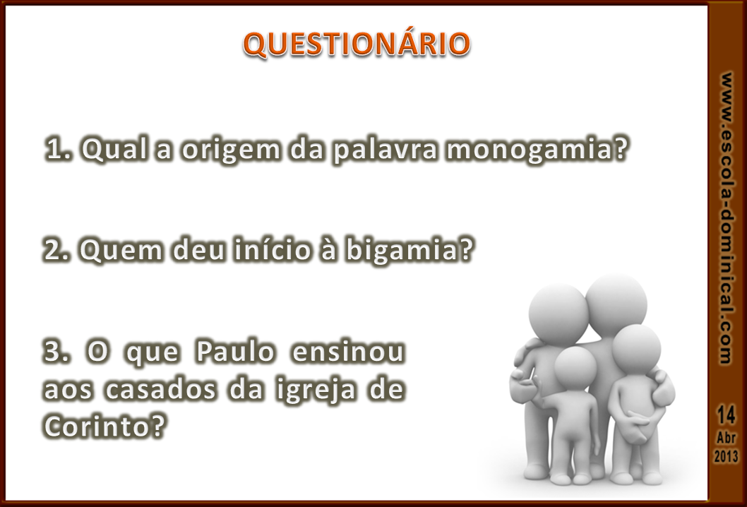 Revista Lições Bíblicas. A FAMÍLIA CRISTÃ NO SÉCULO XXI, Protegendo seu lar dos ataques do inimigo. Lição 2 – O casamento bíblico. Texto áureo. Verdade prática. Introdução. I – O princípio da monogamia. 1. Monogamia X Bigamia. 2. A poligamia torna-se comum. 3. Em o Novo Testamento a poligamia é condenada por Jesus e pelo apóstolo Paulo. A) Uma esposa e um marido. B) A harmonia conjugal. C) A monogamia na liderança cristã. II – O princípio da heterossexualidade. 1. “Macho e fêmea os criou”. 2. “E se unirá à sua mulher”. III – A indissolubilidade do casamento. 1. Uma só carne. 2. A porta de entrada para o divórcio. Conclusão. Editora CPAD. Rio de Janeiro – RJ. 2° Trimestre de 2013.